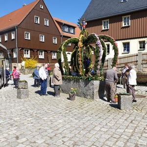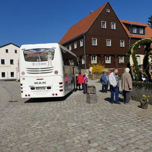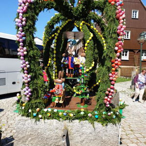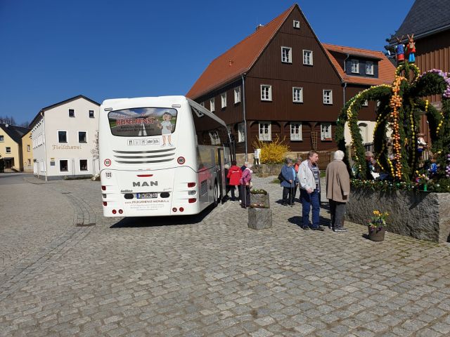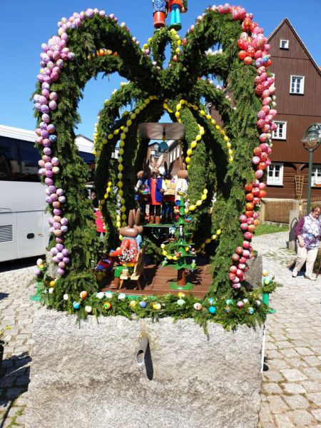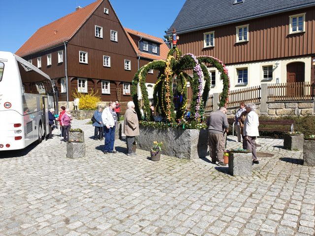 Mit dem Reisebus besichtigen wir heute den Osterbrunnen in Hinterhermsdorf. Zum Glück haben wir schönes Wetter, sodass auch ein Rundgang um den Brunnen möglich ist.